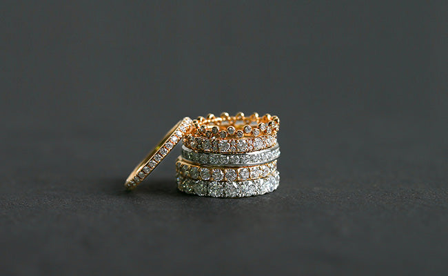 手持ちのリング(レート)と重ね付けすると、ハイブランドジュエリーに引けを取らないくらいゴージャスになります。エタニティは勿論、シンプルな地金リングと合わせるのも、単体でつけるのもオススメです。