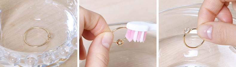 ② しばらくジュエリーを浸け置き、汚れを浮き立たせます。