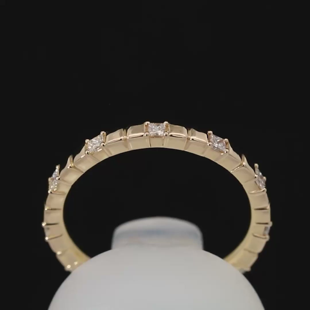 キューブ状の地金にプリンセスカットダイヤモンドを配し、直線的で端正な表情に。プリンセスカットダイヤモンドは隅々まで光を捉え、地金のデザインを引き立てながら、凛とした輝きを添えます。