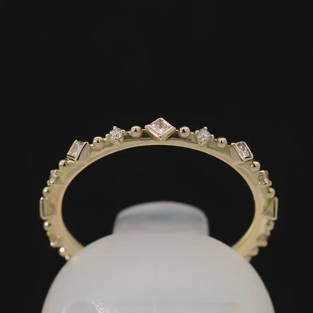 シャープな印象を保ちながら、 指あたりに配慮し、細部まで設計を行っています。ダイヤモンドのセッティングもすっきりと整えることで、重ね付けもしやすく、デイリーに寄り添う、使い勝手のよさも魅力です。