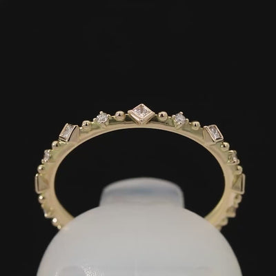 はらだ:プリンセスカット、ラウンドブリリアントカット、そして地金。それぞれ異なる輝きが生むリズムをデザインに落とし込み、新鮮な表情のリングに仕上げました。