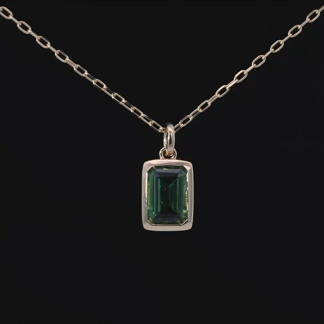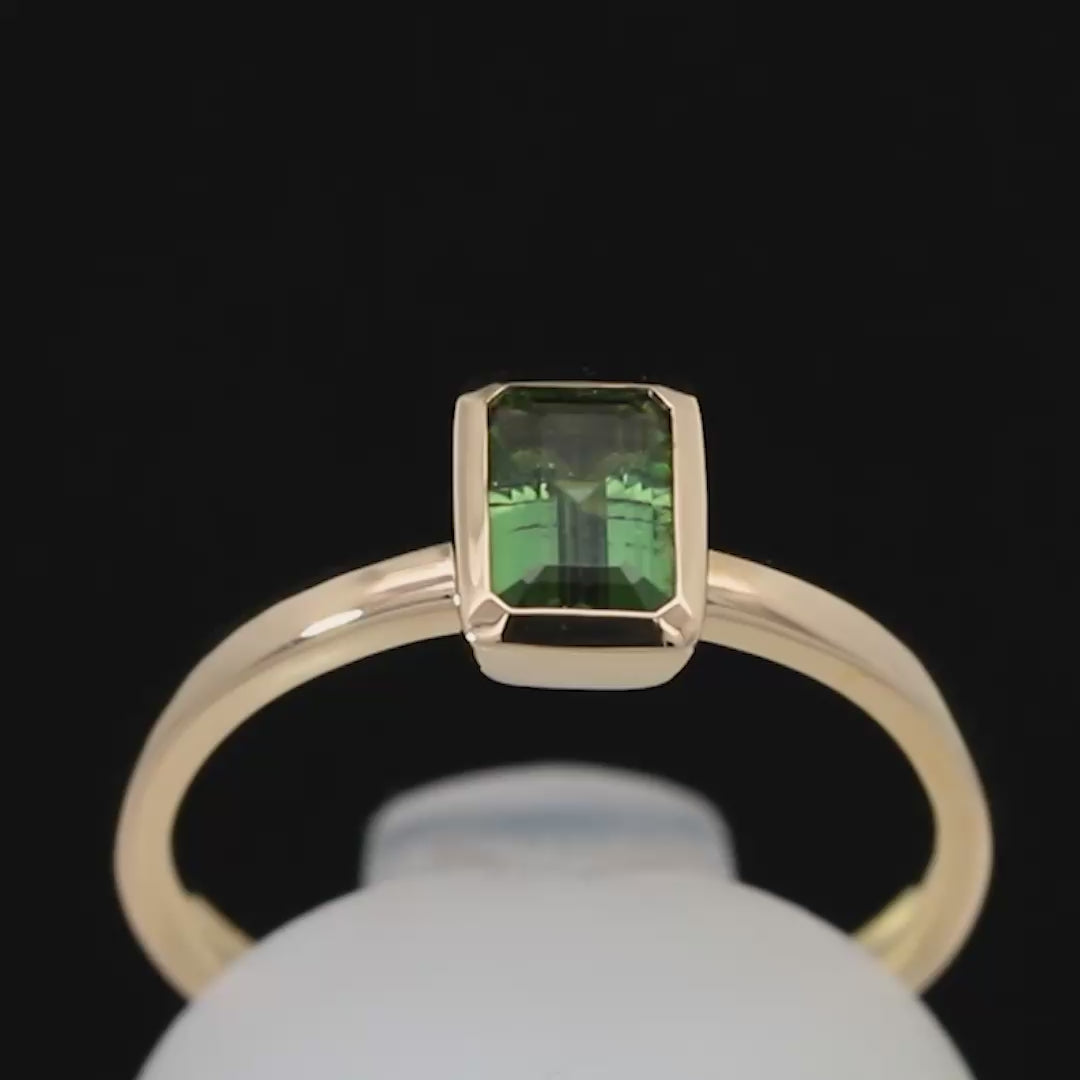凛とした輝きが目を引く、深みのあるグリーンです。エメラルドカットのシャープなラインと、イエローゴールドの枠が絶妙にマッチしています。