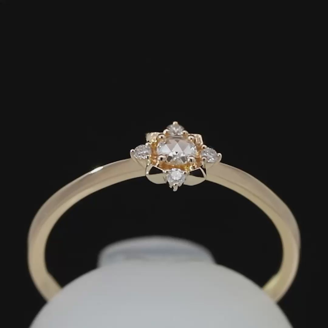 ローズカットの柔らかな輝きと、スタッズの光沢が放射する輝きは、見る角度によって異なる表情を見せ、指先に繊細なきらめきを添えます。